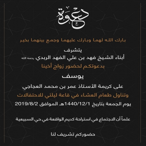 وبهذه المناسبه تتقدم صحيفة وتطبيق بني خالد الإلكترونية بأسمى آيات التهاني والتبريكات للعروسين