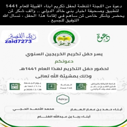 دعوة من اللجنة المنضمة لحفل تكريم أبناء القبيلة للعام 1441 لتطبيق وصحيفة أخبار بني خالد الدولي... والف شكر لمن يحضر وشكر خاص لمن ساهم في إقامة هذا الحفل، نسأل الله التوفيق لجميع.